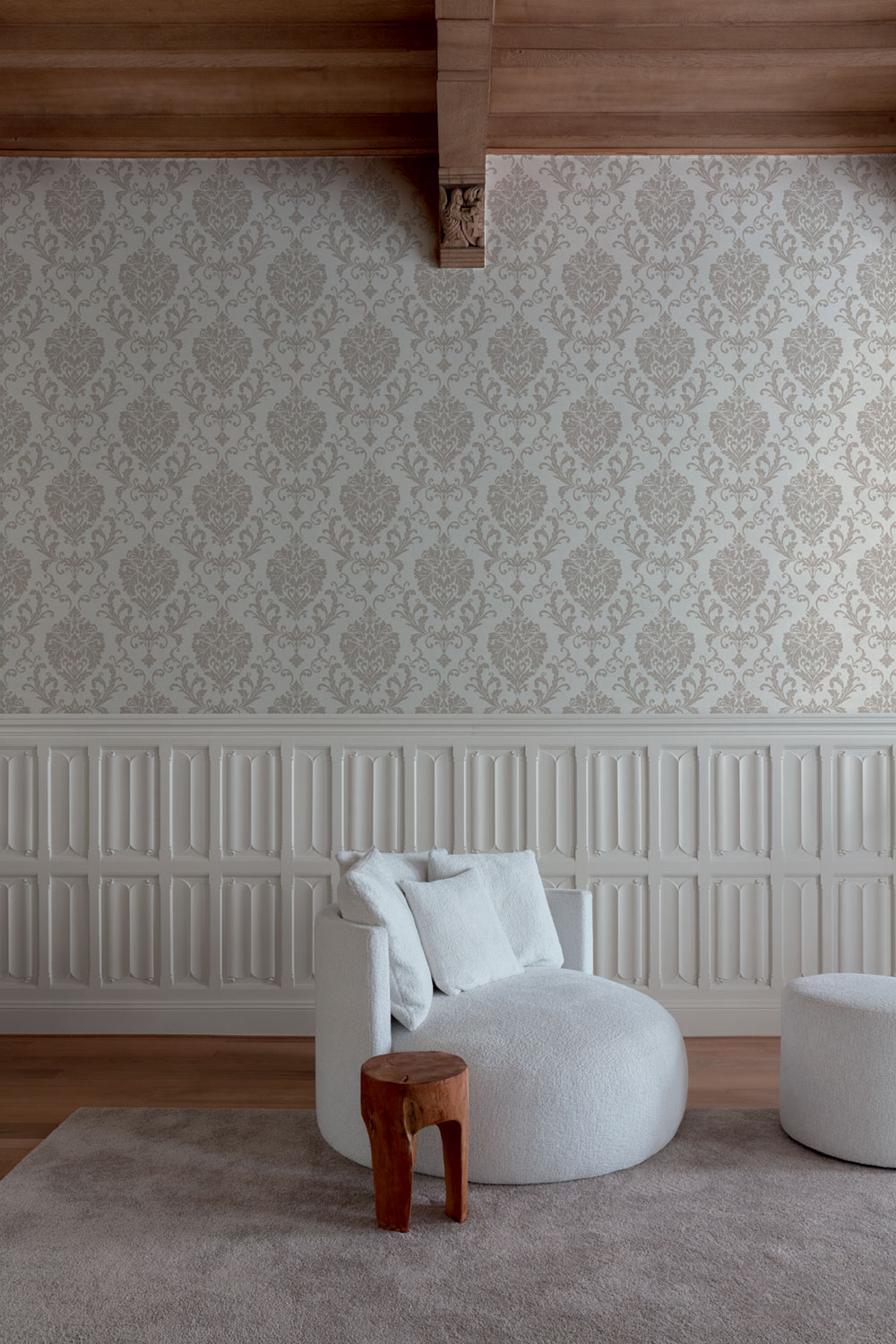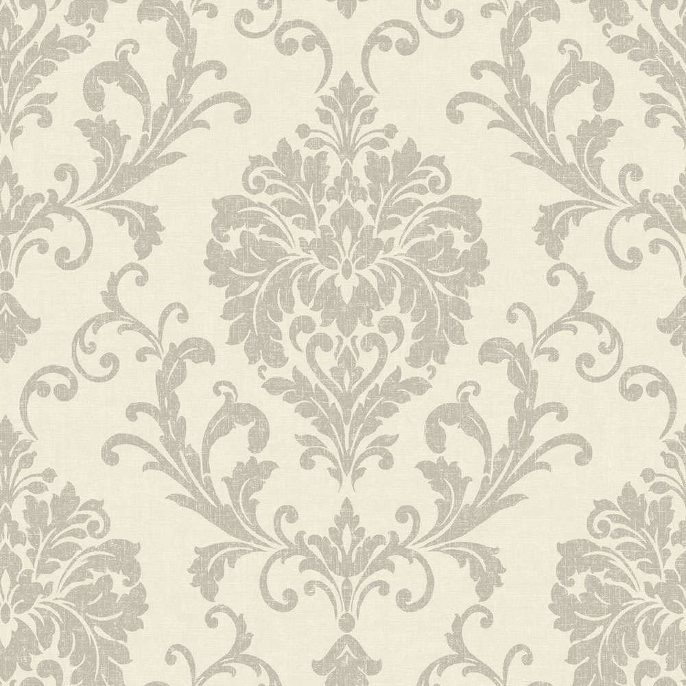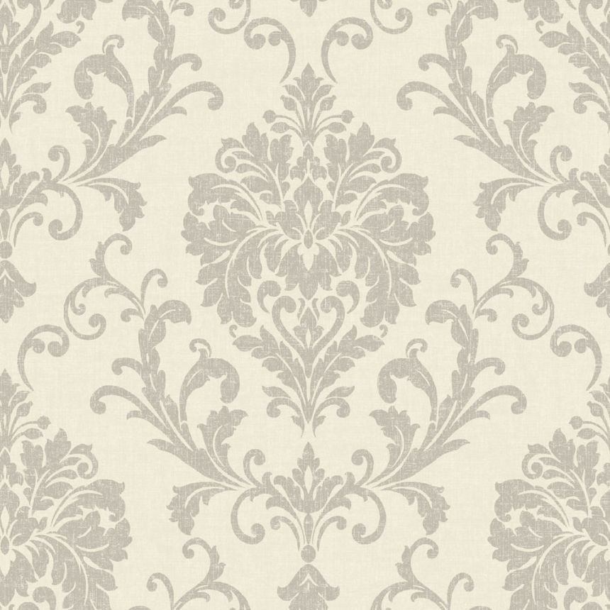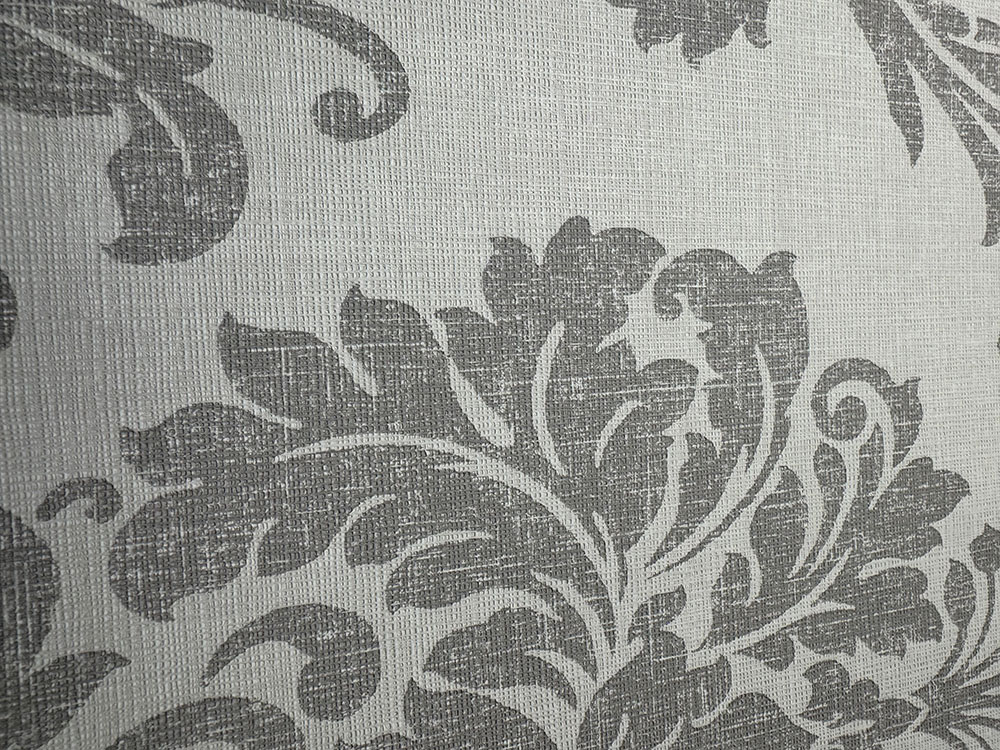 Vliestapete mit Vinyloberfläche, feine Stoffstruktur, ornamentales Barockmuster, Grautöne.