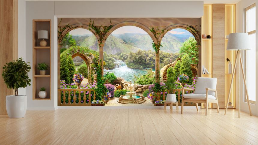 Vlies-Fototapete nach Maß, Mediterrane Terrasse, Brunnen, Wasserfall, 10111, Vavex