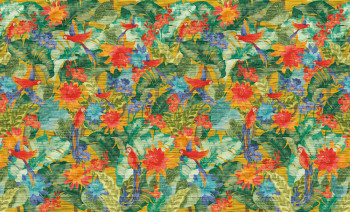 Luxuriöse Vlies-Fototapete mit Vinyloberfläche, gröberer Textur, Motiven aus bunten tropischen Blumen und Papageien.