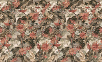 Luxuriöse Vlies-Fototapete mit Vinyloberfläche, gröberer Textur, Motiven aus bunten tropischen Blumen und Papageien.