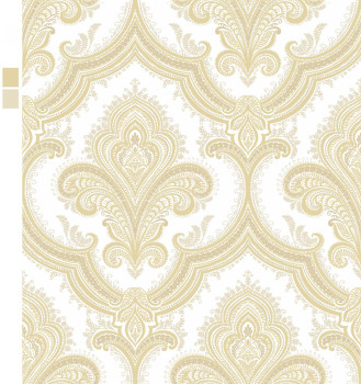 Luxuriöse Vliestapete mit Vinyloberfläche, Barockmuster in halbglänzenden Creme- und Beige- und Goldbeigertönen.