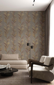 Vliestapete mit Vinyloberfläche, grau-brauner Streifenhintergrund mit Blattmotiven in metallisch glänzenden Gold-, Grau-, Braun- und Violetttönen.