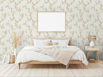 Vliestapete mit Vinyloberfläche, cremefarbener Streifenhintergrund mit Blattmotiven in metallisch glänzenden Gold-Beigetönen.