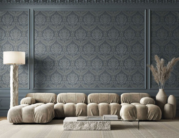 Vliestapete mit Vinyloberfläche, Blau- und Brauntöne, barockes Damastmuster, textile Struktur.