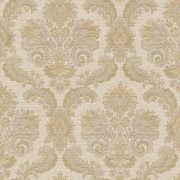 Vliestapete mit Vinyloberfläche, Beige- und Goldbeigetöne, barockes Damastmuster, textile Struktur.