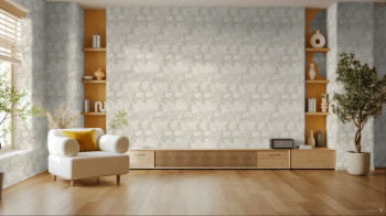 Vliestapete mit Vinyloberfläche, Beige-Grautöne, Umrisse von Bäumen, textile Struktur.