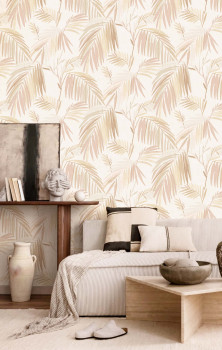 Luxuriöse Vliestapete für die Wand, plastische halbglänzende Palmenblätter, in Beige-, Ocker- und Altrosatönen.