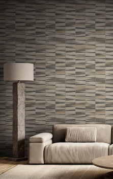 Luxuriöse Vliestapete für die Wand, Stoffoptik, Muster in Grau-, Schwarz- und Brauntönen.