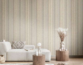 Luxuriöse Vliestapete für die Wand, Stoffoptik, Streifen in Grau- und Beigetönen mit goldenem Halbschimmer.