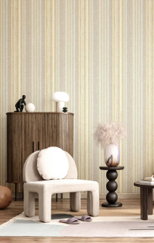 Luxuriöse Vliestapete für die Wand, Stoffoptik, Streifen in Beige-, Hellgrün-, Ocker- und Grautönen.