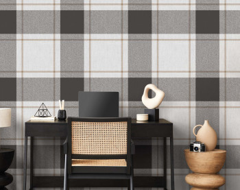 Vliestapete mit Vinyloberfläche, Karo-Muster in Grau-, Schwarz- und Brauntönen in Stoffoptik.
