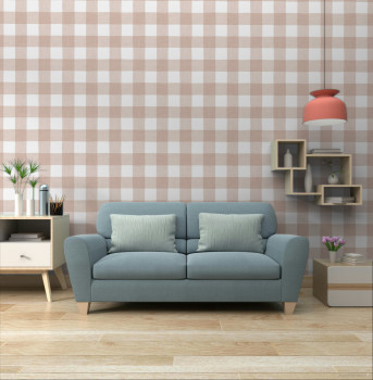 Vliestapete mit Vinyloberfläche, Stoffoptik in Karomuster in Rosa- und Cremetönen.