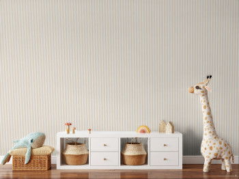 Vliestapete mit Vinyloberfläche, Nachbildung gestreiften Stoffes in Beige- und Weißtönen.