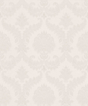 Vliestapete mit Vinyloberfläche, Cremetöne, barockes Damastmuster.