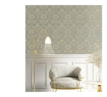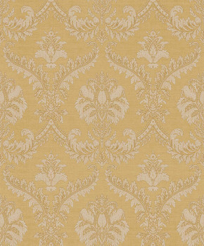 Vliestapete mit Vinyloberfläche, Gold- und Beigetöne, barockes Damastmuster, Schattierungen ändern sich je nach Lichteinfall.