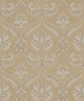 Vliestapete mit Vinyloberfläche, barockes Damastmuster, Braun- und Beigetöne.