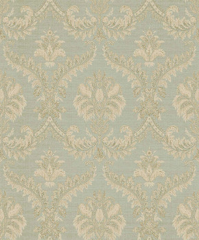 Vliestapete mit Vinyloberfläche, barockes Damastmuster, Grün- und Beigetöne.