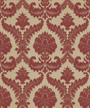 Vliestapete mit Vinyloberfläche, barockes Damastmuster, Beige- und Burgundertöne, Schattierungen ändern sich je nach Lichteinfall.