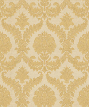 Vliestapete mit Vinyloberfläche, Goldbeigetöne, barockes Damastmuster.