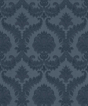 Vliestapete mit Vinyloberfläche, Blautöne, barockes Damastmuster.