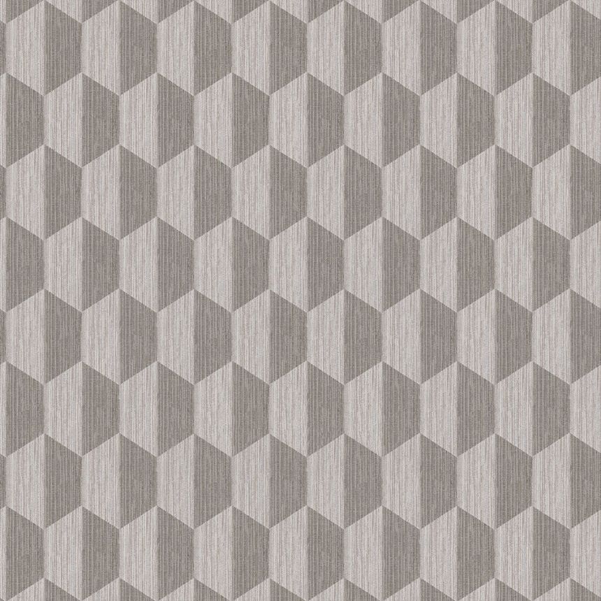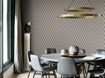 Vliestapete mit Vinyloberfläche mit geometrischem Muster. Braun- und Graubeigetöne, fein gestromte Stoffstruktur.