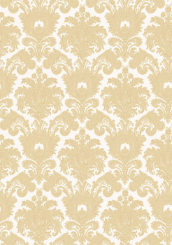Vliestapete mit Vinyloberfläche, barockes Damastmuster - cremefarbener Hintergrund, Muster in Gold- und Beigetönen.