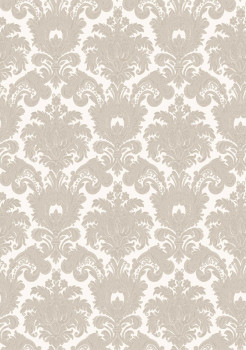 Vliestapete mit Vinyloberfläche, barockes Damastmuster - cremefarbener Hintergrund, Muster in Beigetönen.