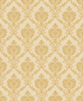 Vliestapete mit Vinyloberfläche, barockes Damastmuster - beiger Hintergrund, goldenes Muster.