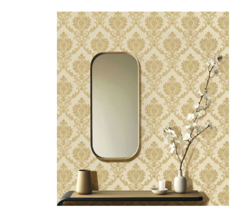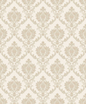 Vliestapete mit Vinyloberfläche, barockes Damastmuster in Beigetönen.