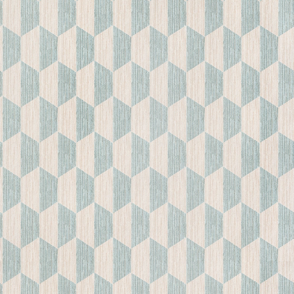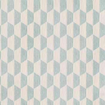 Vliestapete mit Vinyloberfläche mit geometrischem Muster. Blau-, Creme- und Hellbeigetöne, fein gestromte Stoffstruktur.