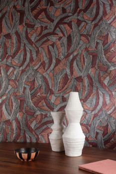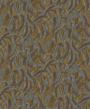 Vliestapete, Blätter-/Federmuster in Braun-, Goldbeige- und Grautönen.