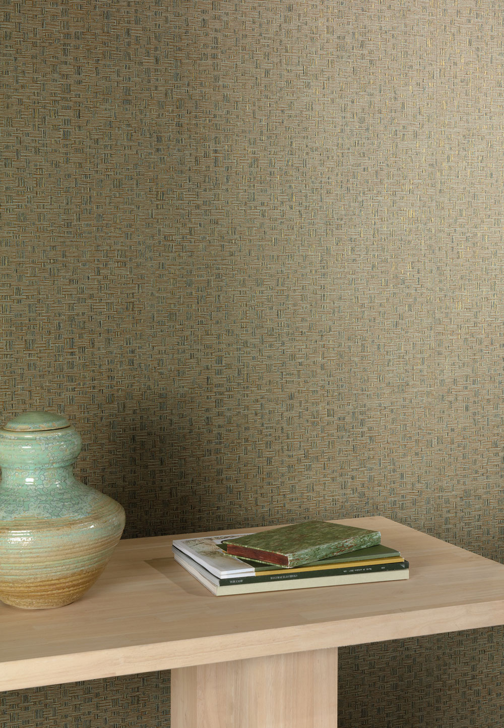 Vliestapete, eingewobenes Muster, das an Stoff in Braun-, Grau- und Schwarztönen erinnert, manchmal mit goldenen Details.