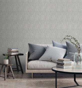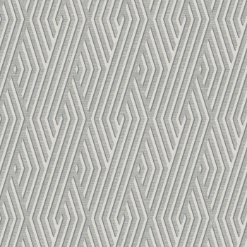 Vliestapete mit geometrischem Muster. Wechsel von glatten und plastischen Texturen in Grautönen, silbernen Metallic-Streifen.