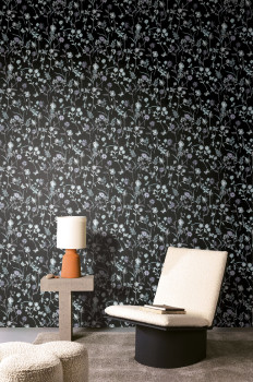 Vliestapete, schwarzer Hintergrund mit Blumenmuster in grün-blauen und violetten Tönen, feine Textur.