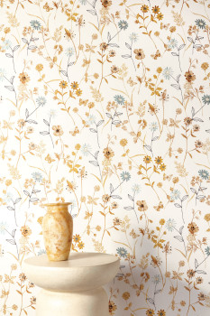 Vliestapete, cremefarbener Hintergrund, Blumenmuster in ockerbraunen Tönen mit metallischem Glanz, türkisfarbene Glanzakzente, feine Textur.