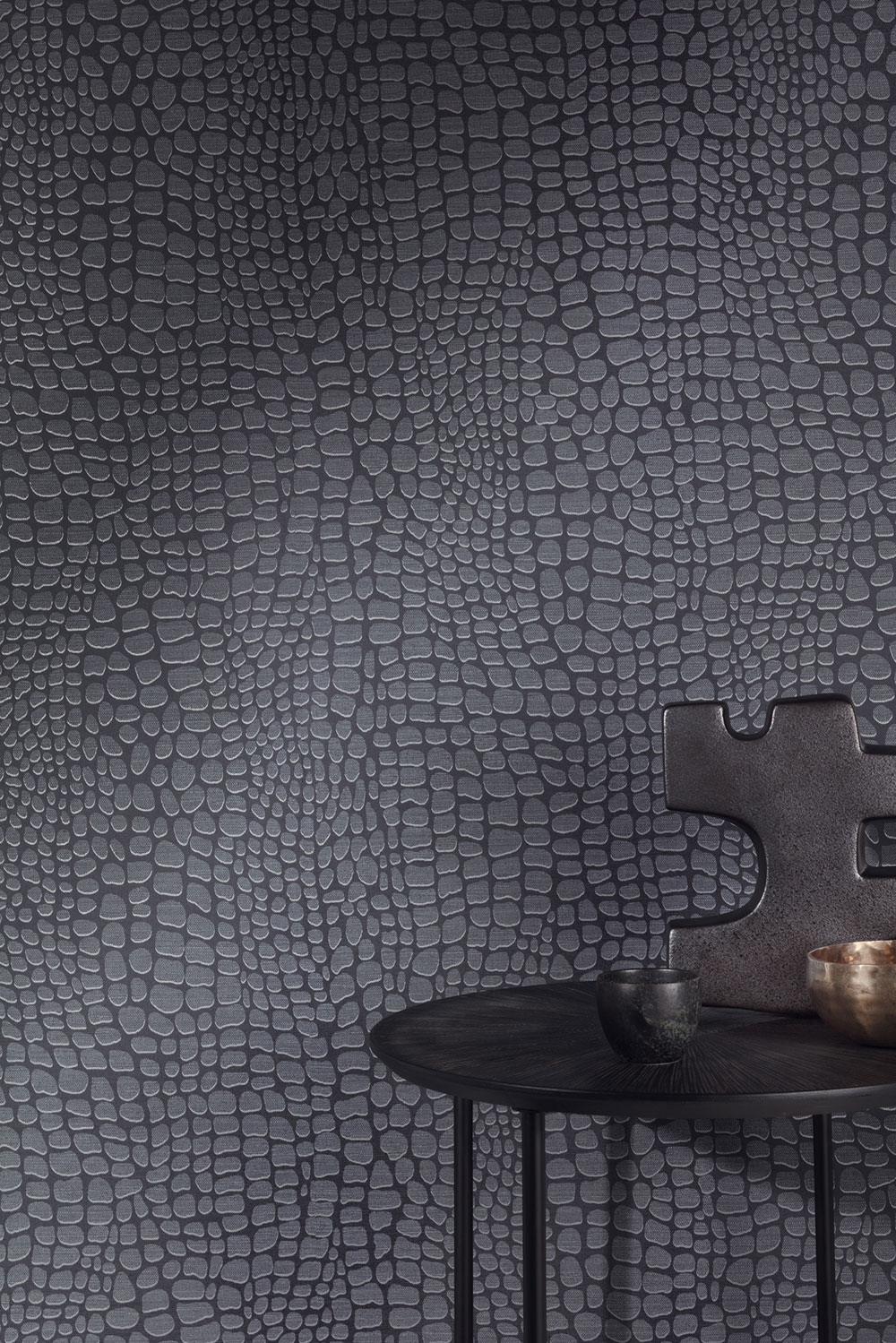 Vliestapete, motiv inspiriert von Tierhaut, grau-schwarze Töne mit silbernen Details.