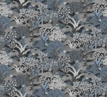 Vliestapete, Motiv aus Natur und Tieren, Töne in Schwarz, Grau und Blau.