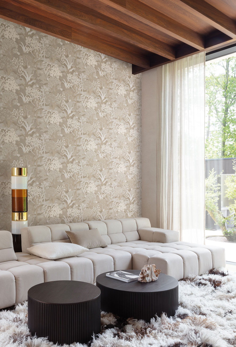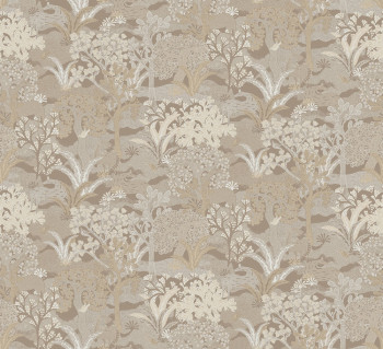 Vliestapete, Motiv aus Natur und Tieren, Braun- und Beigetöne, stellenweise metallischer Glanz.