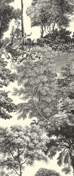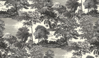 Bildtapete, leicht strukturierte Stoffoptik, romantische Landschaft in Grau- und Schwarztönen.