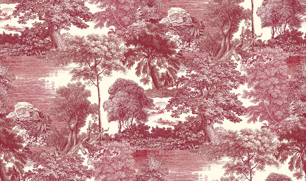 Bildtapete, leicht strukturierte Stoffoptik, romantische Landschaft in weinroten Farbtönen.