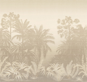 Bildtapete, leicht strukturierte Stoffoptik, tropische Landschaft mit Palmen in Grau- und Sandtönen.