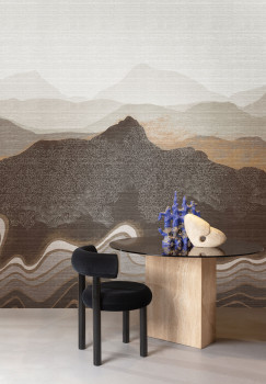 Bildtapete, leicht strukturierte Stoffoptik, Berglandschaft in Braun- und Grautönen.