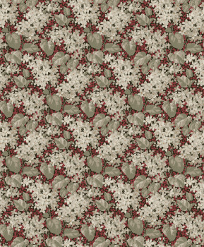 Vliestapete für die Wand, rotschwarzer Hintergrund, blühende Fliedermuster in Grau-Beige- und Grüntönen.