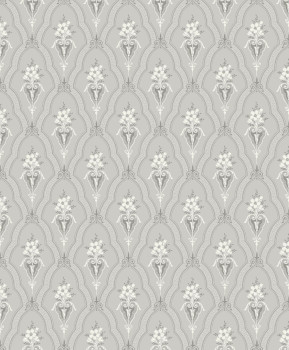 Vliestapete für die Wand, grauer Hintergrund, ornamentales Blumenmuster im Schlossstil.