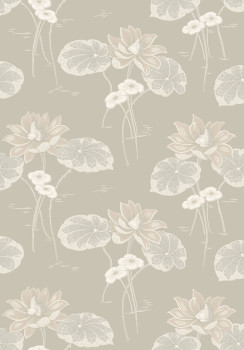 Vliestapete für die Wand, grauer Hintergrund, Seerosenmuster in Grau-Beigetönen.