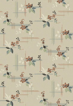 Vliestapete für die Wand, beiger Hintergrund, Blumen- und geometrische Muster in Blau-, Grün- und Braun-/Terrakottatönen.
