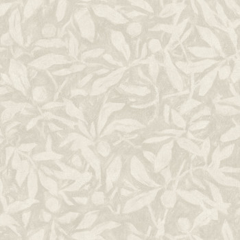 Vliestapete für die Wand, Blättermotive in Grau-Beigetönen.