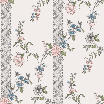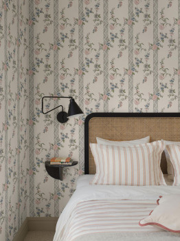 Vliestapete mit floralen Aquarelldetails und senkrechten Streifen auf cremefarbenem Hintergrund – inspiriert vom gustavianischen Muster aus dem 18. Jahrhundert.