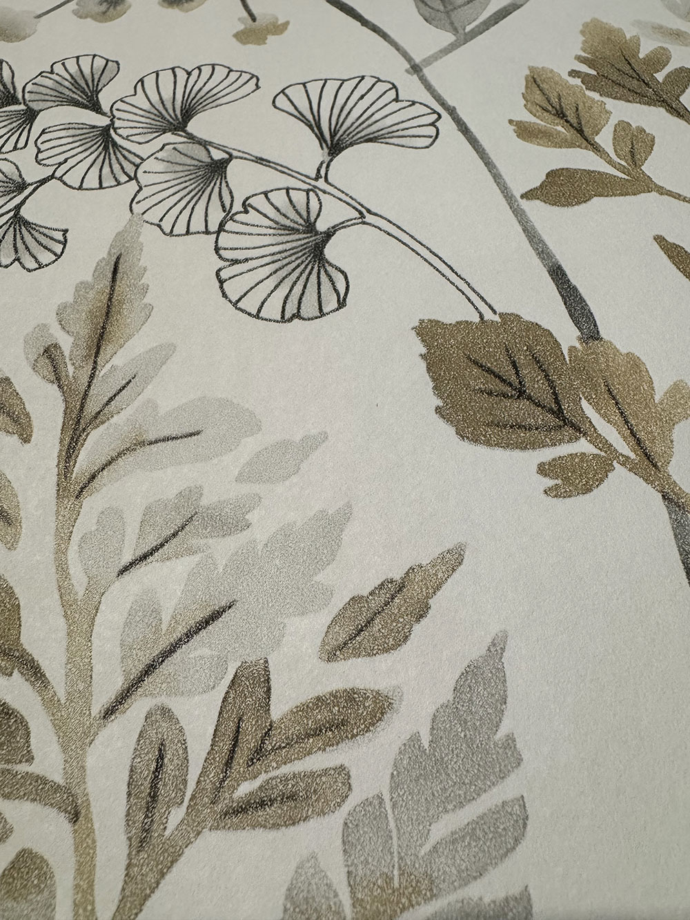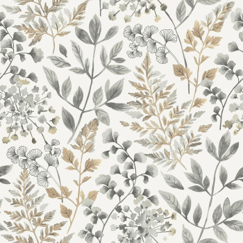 Tapete mit Aquarellmuster aus Farnen, Gräsern und Blättern in Grau- und Brauntönen.