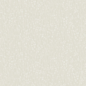 Tapete mit stilisiertem Muster aus Zweigen und Blättern in warmen Beigetönen.